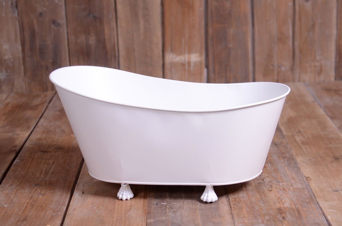 Vasca da bagno in metallo, realizzata a mano e decorata in stile vintage. Questo prodotto, per le sue dimensioni, è ideale per le sessioni neonatali e per le sessioni baby. Grazie al trattamento impermeabilizzante, questa vasca può essere riempita. Consigliamo inoltre di utilizzare la nostra schiuma sintetica per simulare le bolle di sapone e le paperelle di gomma per aggiungere un tocco divertente alle foto.