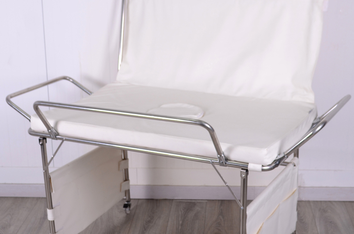 ciotola di posizionamento. Include anche un set di quattro ruote in silicone rimovibili. Dispone inoltre di tasche laterali per riporre gli accessori. Per una maggiore sicurezza, la struttura è dotata di una barra posteriore autobloccante e di 4 staffe su ogni gamba. Inoltre, sotto il materasso sono presenti diverse piastre in acciaio inox.