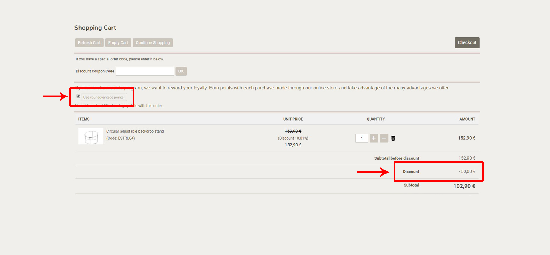 To finish the process, when you have all the items in your shopping cart, you can see at the top of it a box that you must check to apply your loyalty-point discount on that purchase. If you check this box, the discount will be applied directly to the final amount of your order.